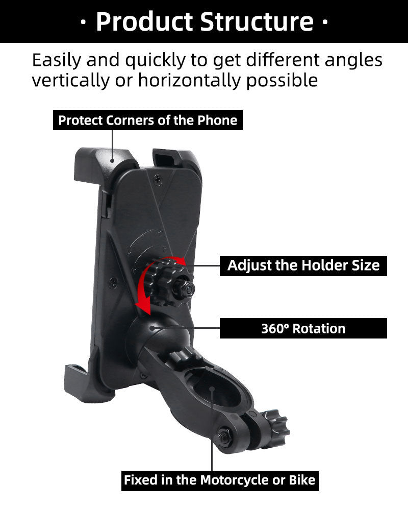 Motorcycle or bicycle handlebar diameter: 18-30mm Size 120mm < phone ’s length < 180mm 60mm < Phone’s wide < 90mm