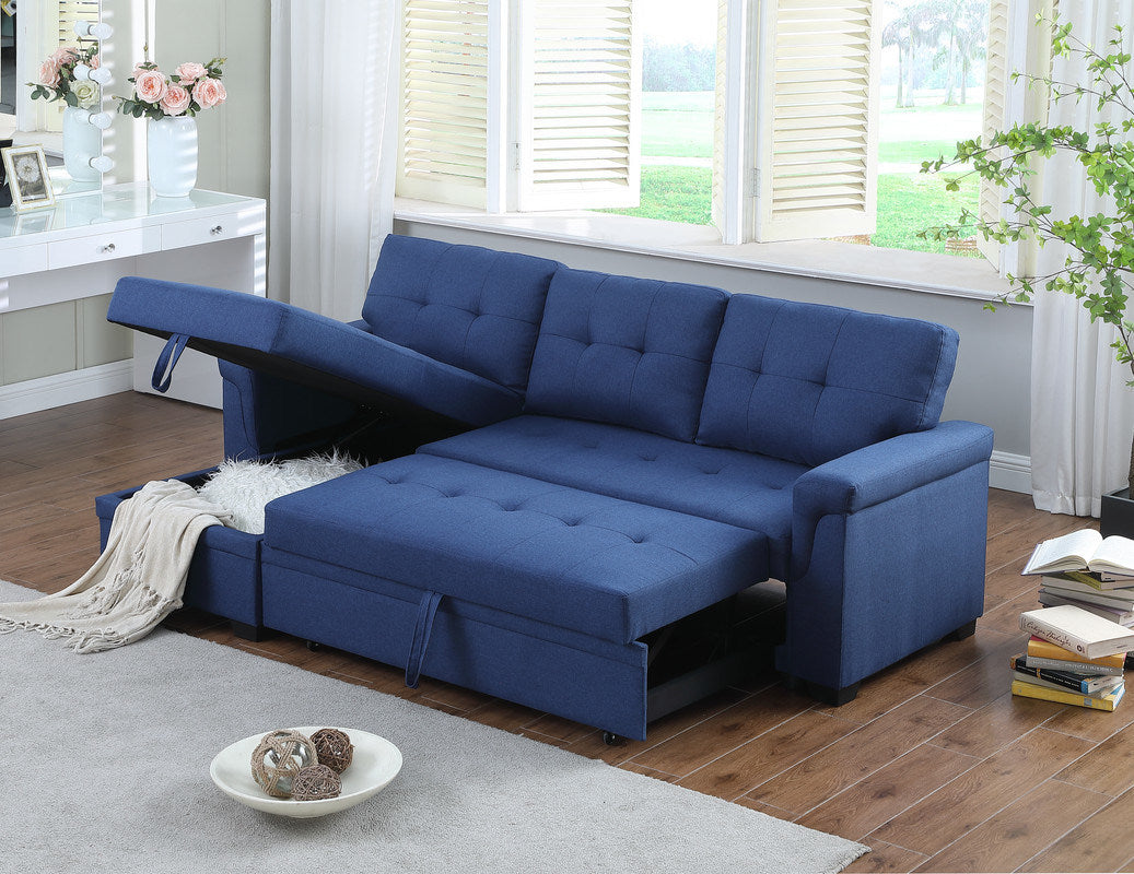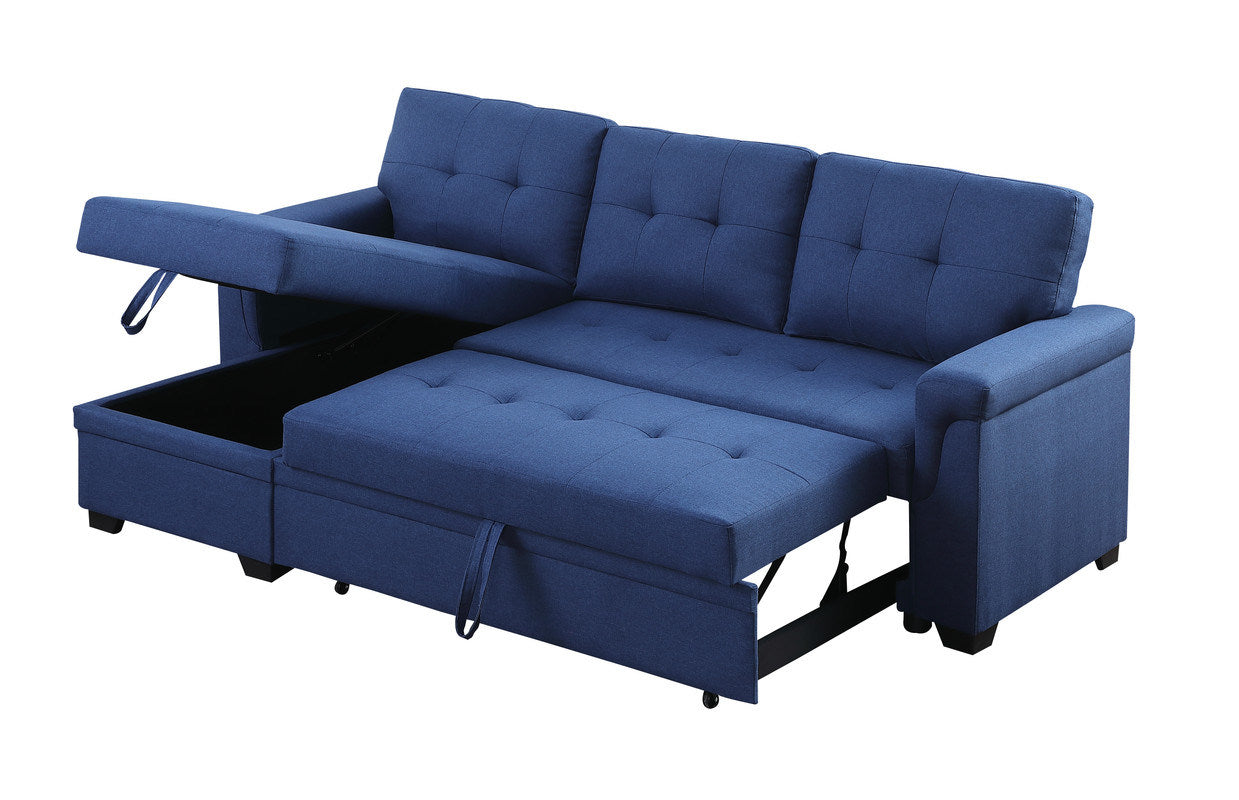 Lucca 84" Blue Linen Reversible Sleeper Sectional Sofa with Storage Chaise