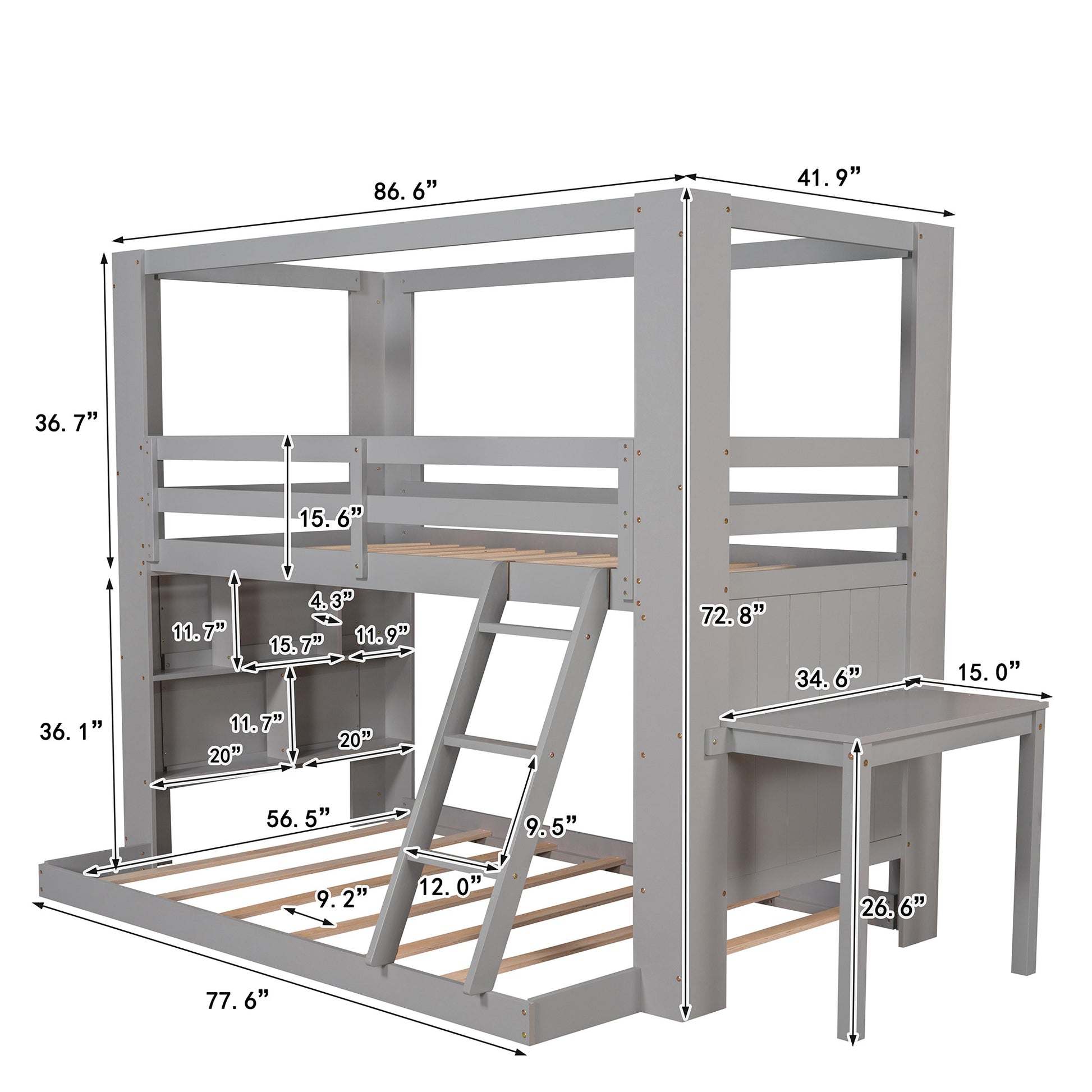 Twin Over Full Bunk Bed with Desk Storage Shelves.Reinforced Structure Bunk Beds Solid Wood Bed Frame for Kids Teens